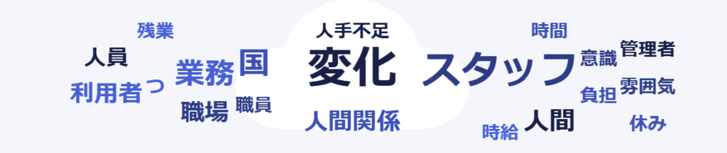 このたびの調査では、介護現場で働く多くの職員の皆さまから、切実かつ率直な声が数多く寄せられました。利用者との関わりにやりがいを感じる一方で、慢性的な人手不足、過重労働、報酬や評価への不満、人間関係のストレス、指導環境の未整備など、現場の負担感と課題の深刻さが明らかになっています。