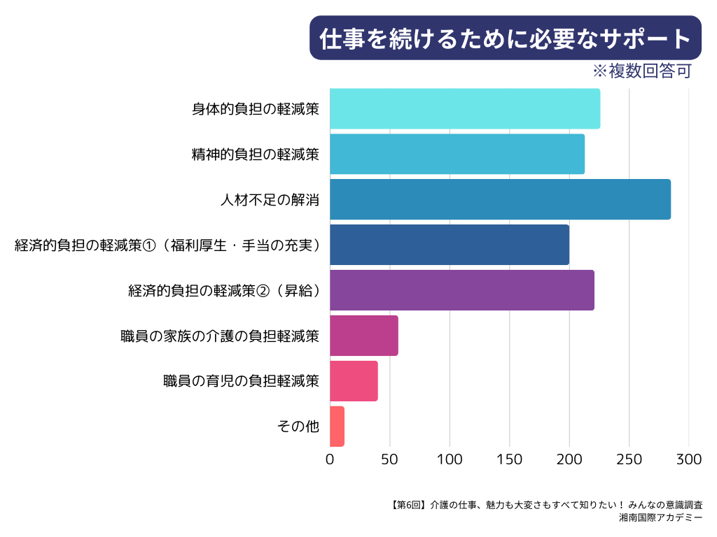 さらに、介護職の専門性や社会的評価に対する課題意識も根強く、「専門職として正しく評価されたい」という声が多く寄せられています。これは単なる待遇改善にとどまらず、職業としての価値向上が求められていることを示しています。
